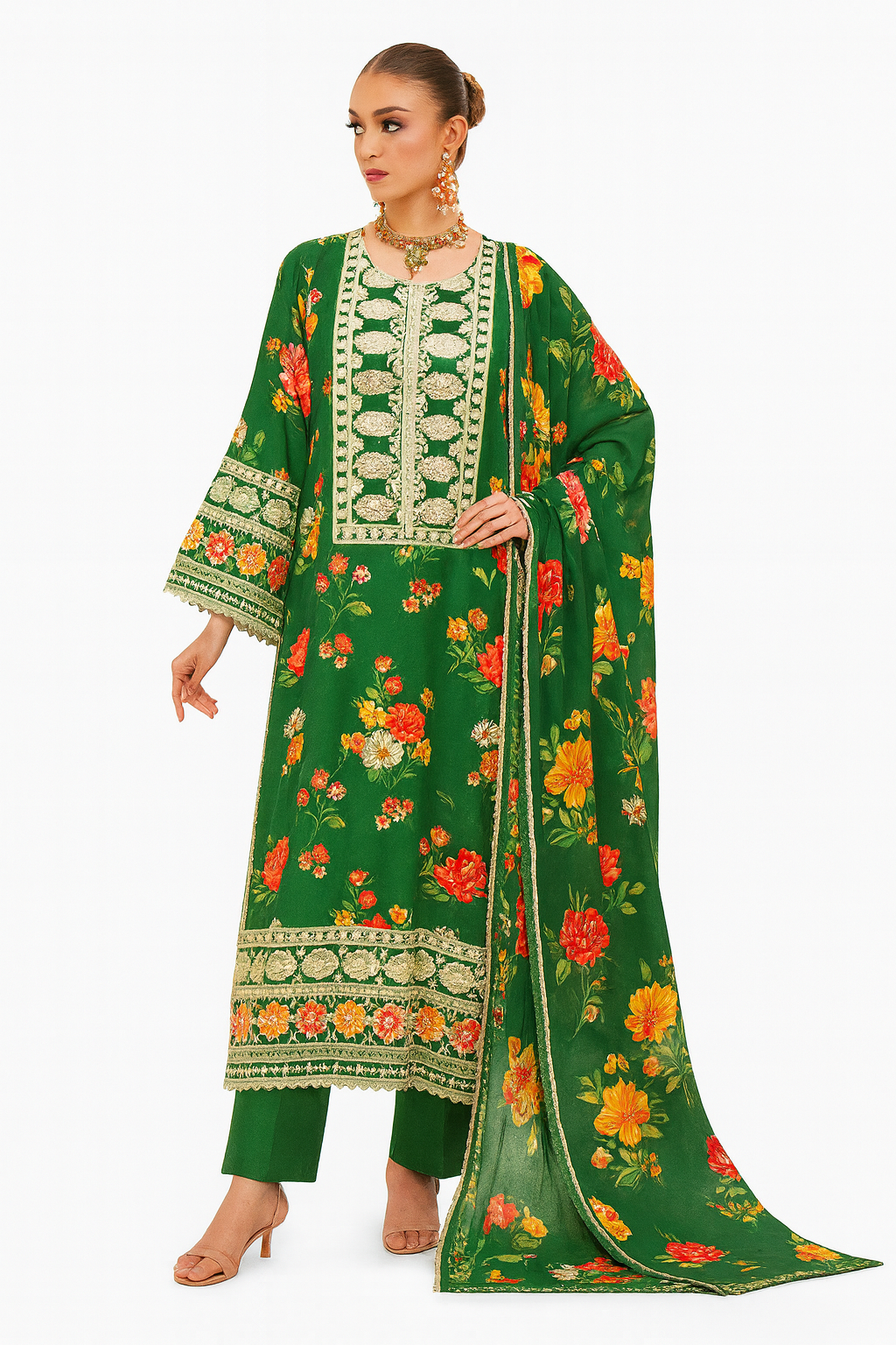 Celebrate the festive season in full bloom with Aneela’s Festive Silk Collection, featuring this exquisite green floral embroidered silk outfit. Crafted from premium Shamoz silk, the ensemble showcases a beautifully embroidered digital-printed front, vibrant floral silk sleeves, and an embroidered organza patch that adds a touch of luxury.