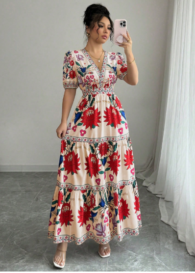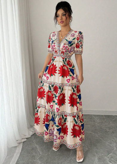 Elenzga Women’s Floral Print V-Neck Ruffle Hem Long Dress